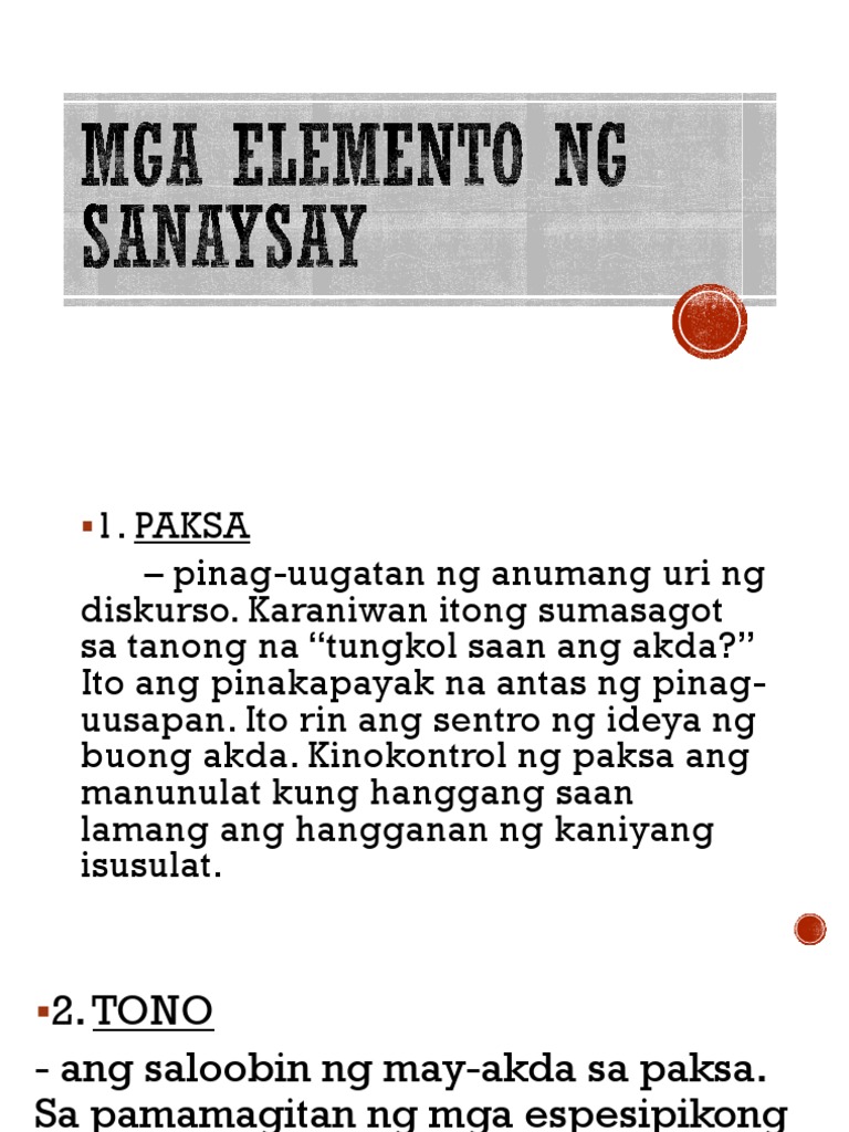Kahulugan Ito ay isang sulating gawain na kung saan itoy kadalasang naglalaman ng mga pananaw kuro-kuro o opinyon ng isang awtor o akda. Maaaring ipahayag nang tuwiran o di tuwiran ang pangunahing paksa. Ang kabuuan ng sulatin gaano man kahaba ay iisa lamang ang paksa.