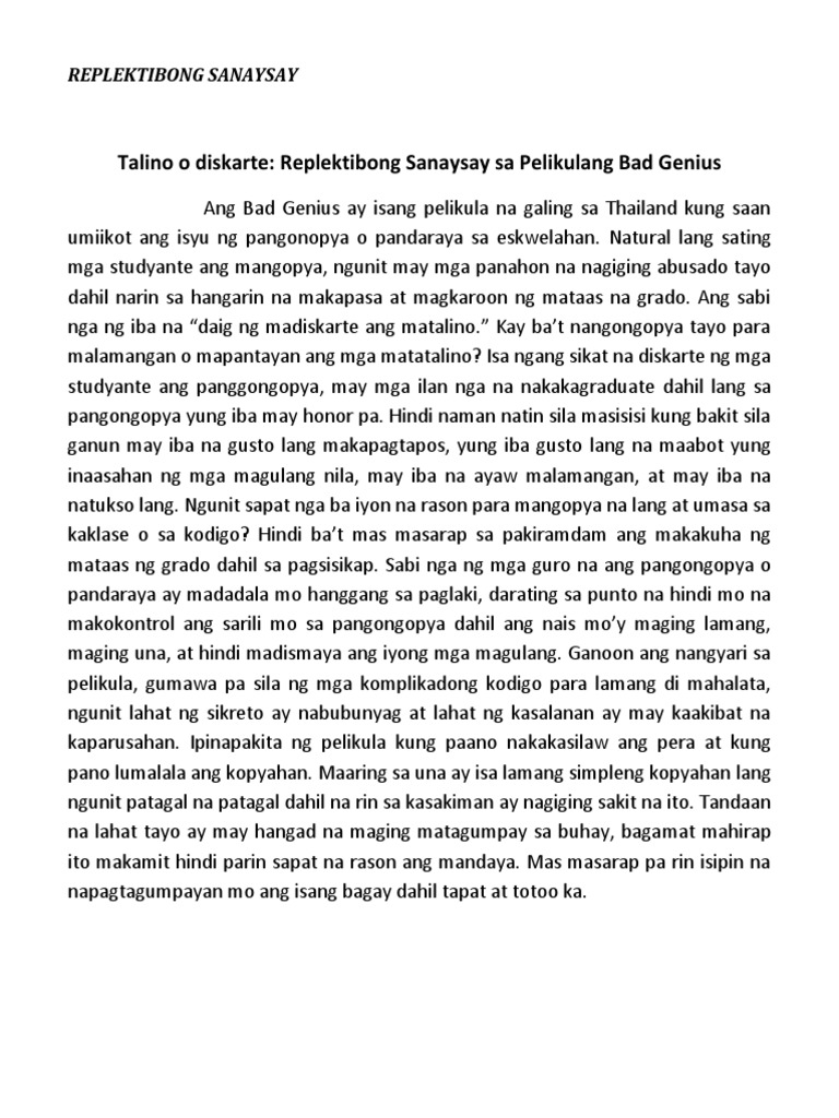 Bad genius replektibong sanaysay. Pages 5 This preview shows page 3 - 5 out of 5 pages. Lesen Sie 30 Tage kostenlos. Ito ay isang masining na pagsulat na may Layunin.