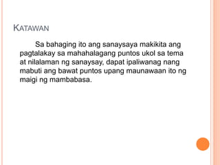 Katawa n-sa bahaging ito ng sanaysay makikita ang pagtalakay sa mahahalagang puntos ukol sa tema at nilalaman ng. Mga elemento ng sanaysay at kahulugan. Ito ay ang pormal at di-pormal.